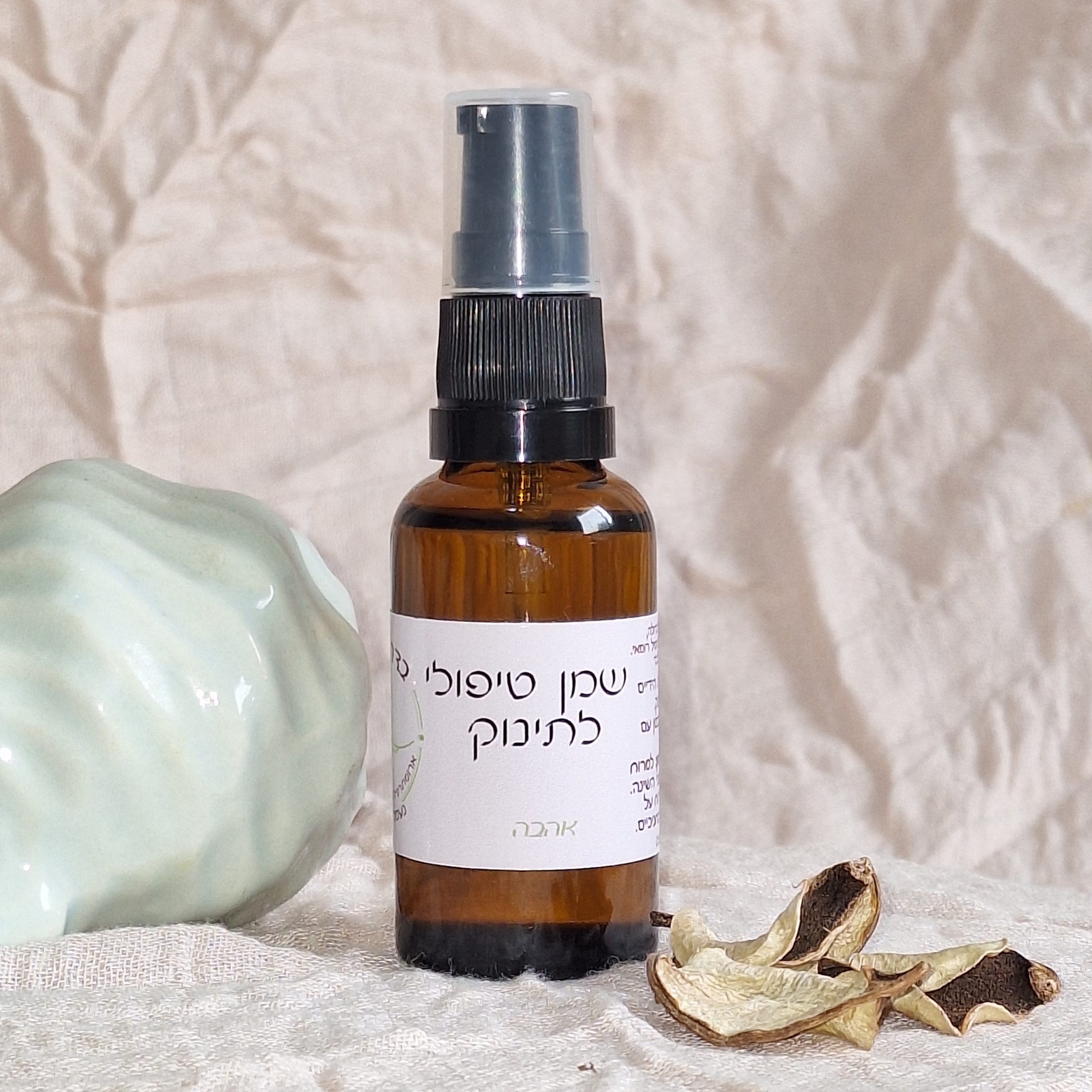 שמן טיפולי לתינוק מיועד למריחה, מכיל שמן שקדים עם שמנים אתריים טהורים: לבנדר, קמומיל רומאי, במינון מתאים לשימוש מגיל 3 שבועות.